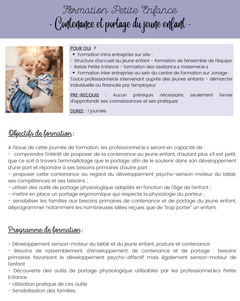 La contenance et le portage permettent de répondre aux besoins primaires et physiologiques du jeune enfant, tant sur le plan moteur en soutien de son développement, que sur le plan psychique, en soutien aux besoins de réassurance, de proximité, de sécurité de l’enfant.