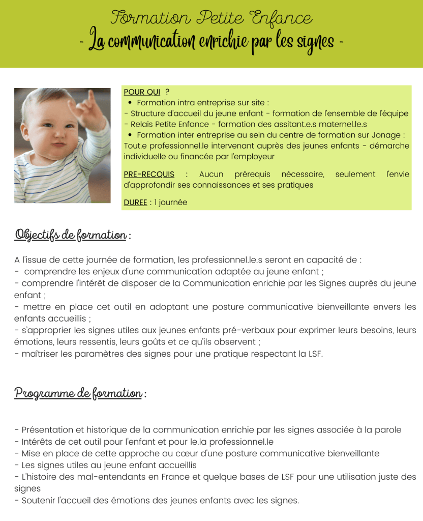La Communication Gestuelle associée à la parole enrichit la pratique professionnelle dans une démarche d’attention, d’observation et de bienveillance et permet d’affiner les réponses de l’équipe aux besoins ou émotions exprimés par l’enfant accueilli.