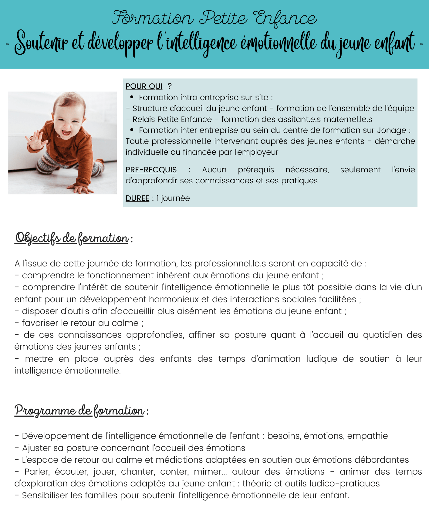 Consultez également le calendrier des formations proposées en présentiel directement dans la rubrique agenda – calendrier des formations Petite Enfance