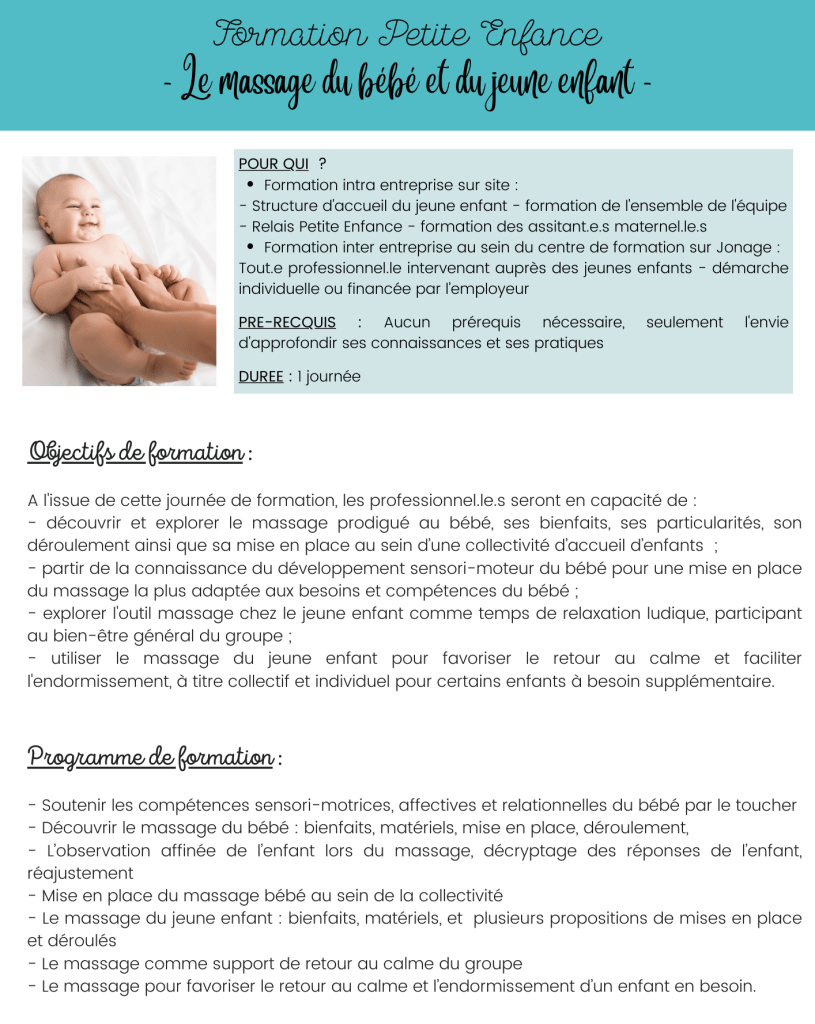 Le massage auprès du jeune enfant est également un outil de relaxation ludique des plus agréables pour éveiller les jeunes enfant à leur corps, à leur sensorialité, à la détente ou encore permettre de soutenir le retour au calme du groupe.