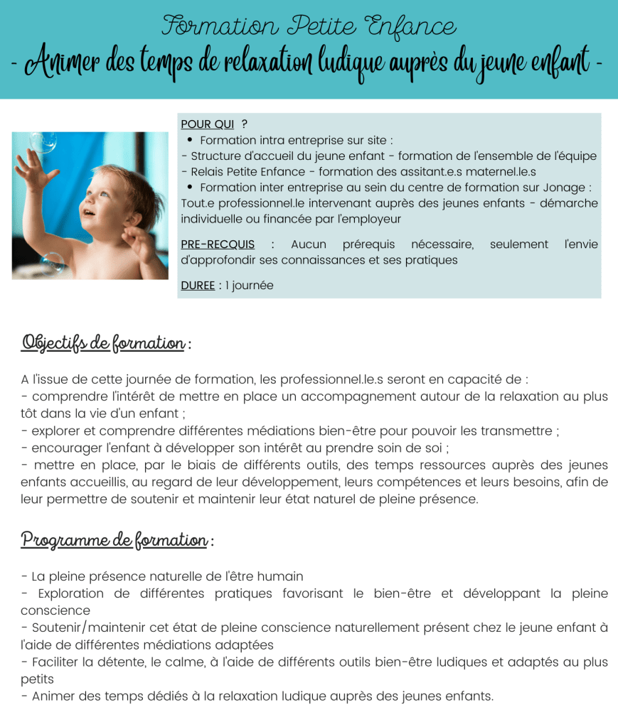 Riche d’un accompagnement mensuel de 2 ans sur 2 structures différentes autour de temps d’animation de relaxation ludique auprès des enfants, j’ai pour souhait de mettre à profit cette expérience enrichissante auprès des professionnel.le.s qui souhaiteraient à leur tour pouvoir animer des temps ressources auprès des jeunes enfants qu’ils ou elles accueillent.