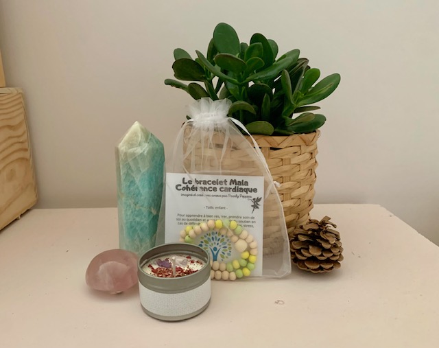 Le bracelet est présenté dans un sachet organza avec sa notice qui explique en détail comment l’utiliser pour pratiquer la cohérence cardiaque.